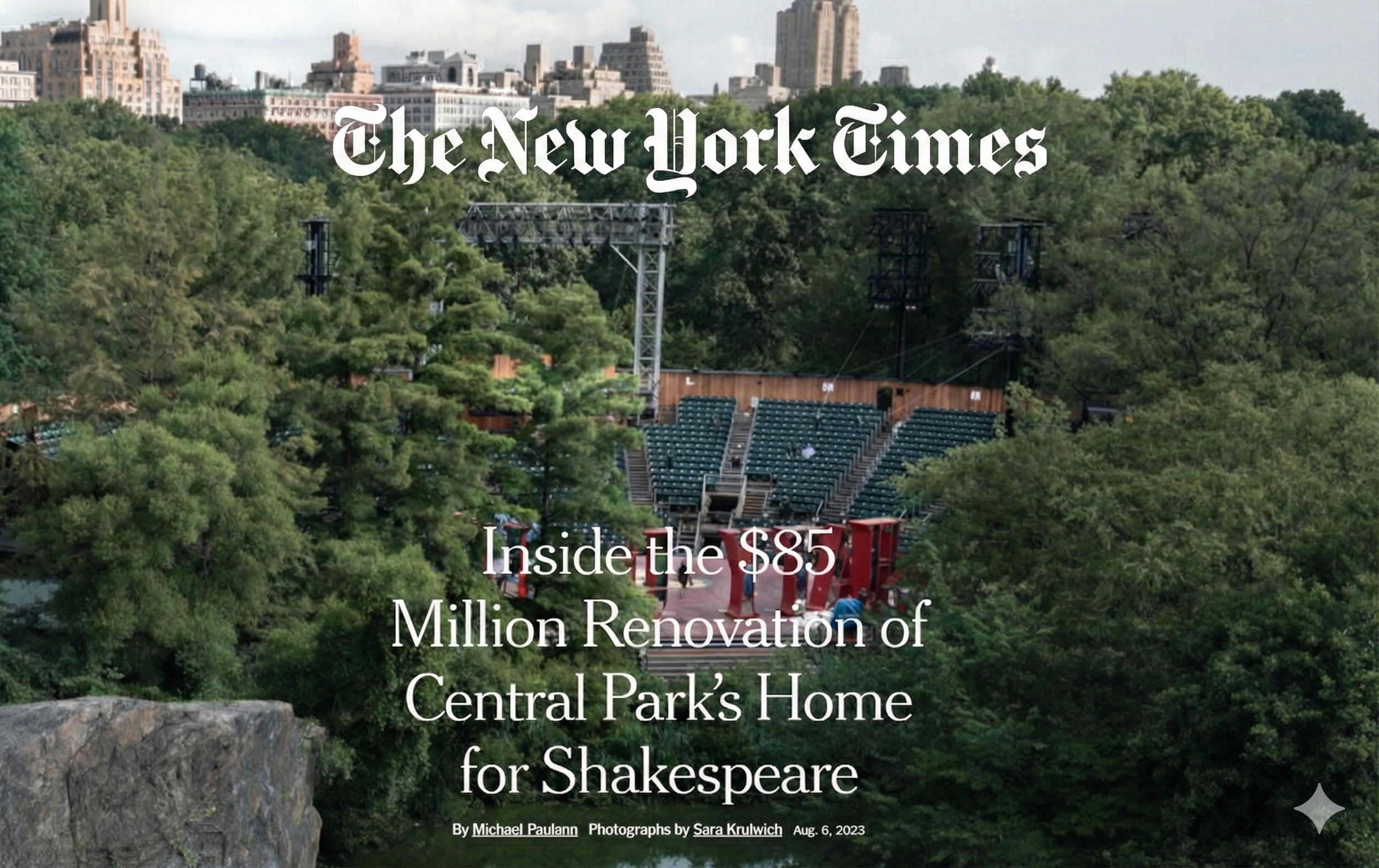 Part of the leadership team that oversaw the $85 million renovation of the historic Delacorte Theater in Central Park. The revitalization features a striking new façade made from reclaimed redwood water towers, expanded accessibility for audiences and artists, and modernized backstage facilities while preserving its beloved open-air character. This project ensures that Joseph Papp's vision of free theater for all New Yorkers remains sustainable for future generations.